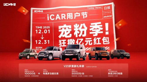 岁末将至,是时候用一份厚礼犒赏过去一年辛勤奋斗的自己。iCAR品牌深知这份期待,特别启动“iCAR用户节宠粉季”活动。作为新能源方盒子市场的销量冠军,iCAR超级V23家族携满满诚意登场。即日起至12月31日,选购超级V23家族,不仅能抢万元购车券,还有金融贴息、终身权益大礼包等多重惊喜叠加。不玩套路,唯有真诚,为您献上一场年终购车盛宴。